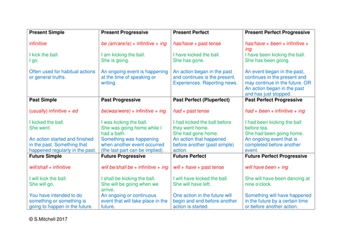 Verb Tense Chart helps great to NON-English peoples. It shows times (the past, present and future. Past Simple Use for an action that happened at a point in time in the past. e.g. - I ate breakfast this morning.