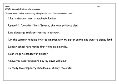 Capital Letters In Sentences Worksheet. These worksheets and printables help students remember the rules about using capital letters. Revise the rules before doing this exercise.